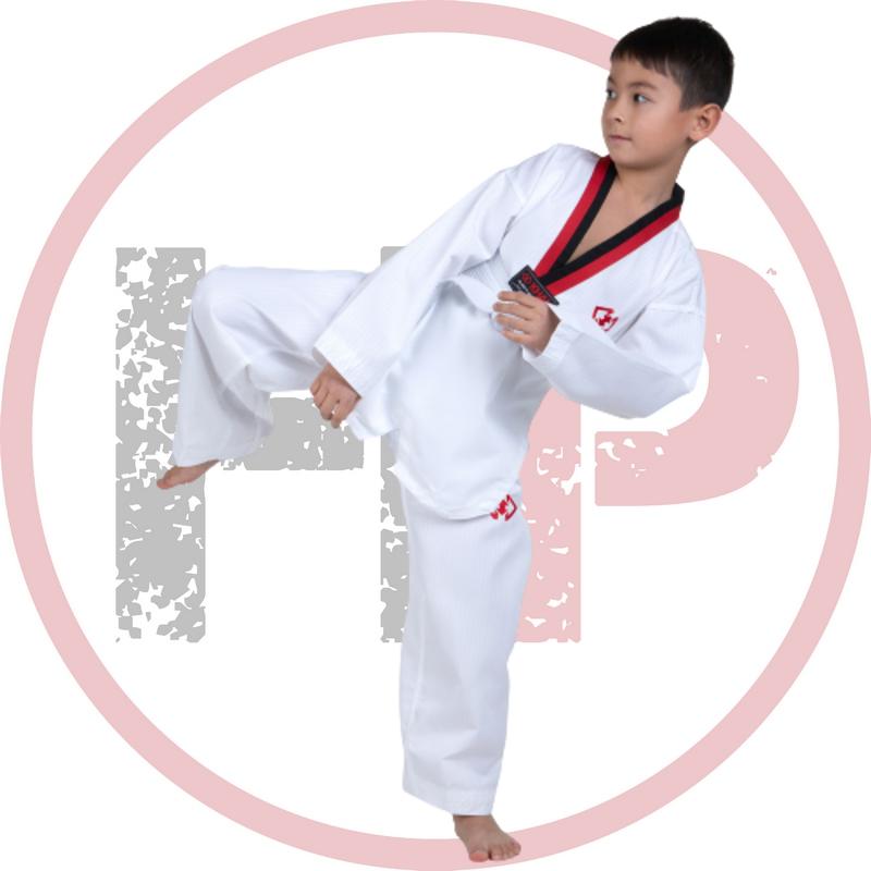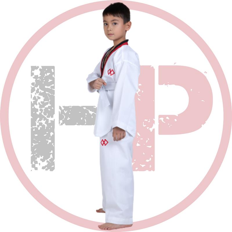 Эта модель, подходящий вариант для интенсивных тренировок. Состоит из 65% полиэстера, 35% хлопка с уникальным плетением. Ткань облегченная, плотность которой всего 8 унций. Но несмотря на это, она износостойкая. Отметим, что добок не мнется, не вытягивается, не линяет, а во время тренировок меньше прилипает к телу. Куртка получила V-образный вырез и красно-черный воротник. Брюки свободного покроя, поэтому имеется широкая резинка и шнурок для того, чтобы они не спадали. В комплект входит куртка, брюки и пояс белого цвета.