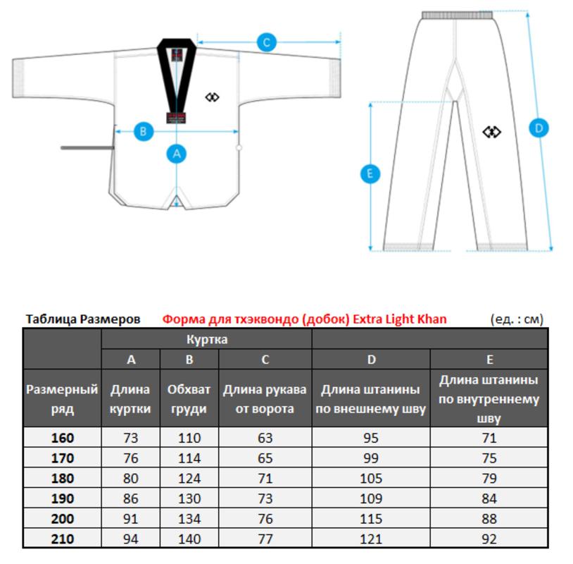 Кимоно для тхэквондо Extra Light Khan является отличным вариантом для тренировок и турниров всероссийского уровня.
