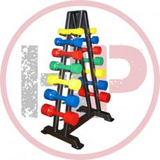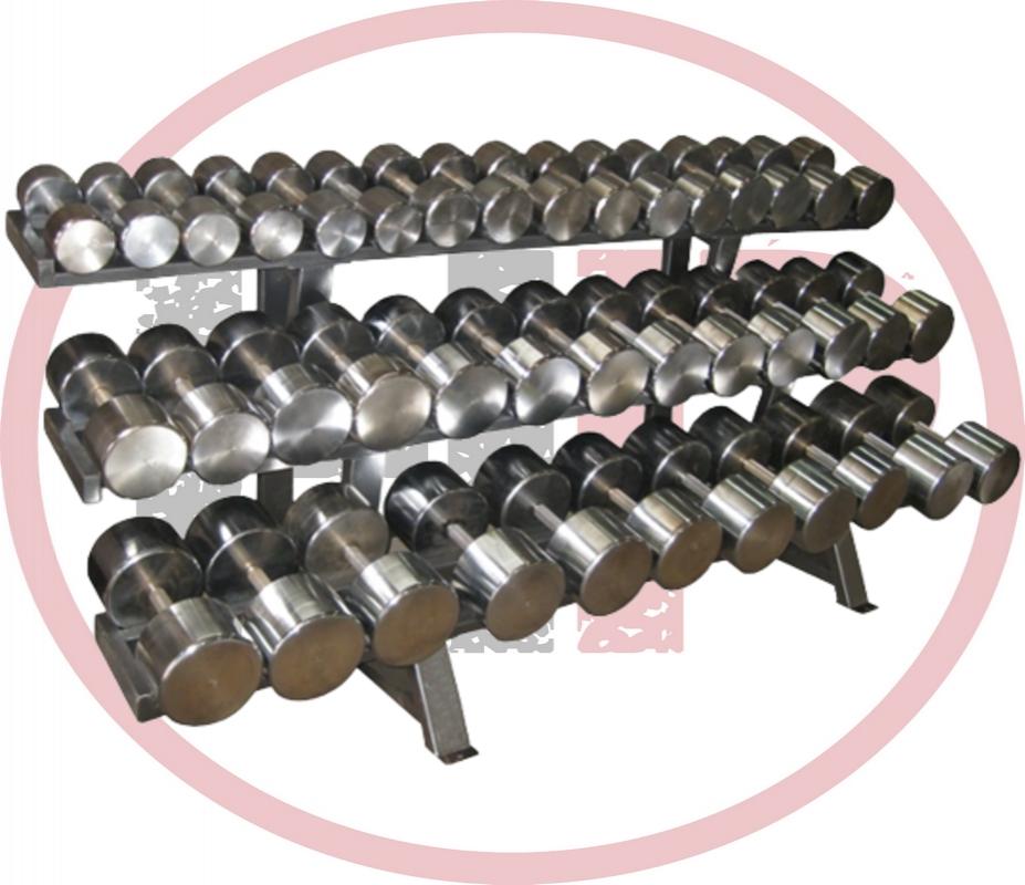 Гантели стальные с комплексным покрытием из никеля и хрома. Основное преимущество стальных хромированных гантелей - их компактность при внушительном весе, из-за высокой плотности стали. Поверхность гантелей шлифована, края закруглены, что делает упражнения комфортными и безопасными; а рукоятки с глубоким рифлением исключают всякое скольжение гантелей в руке. Хромовое покрытие придает шикарный блеск гантелям и эффектный внешний вид всему комплекту. Гантели размещены на трёхрядном стеллаже.