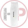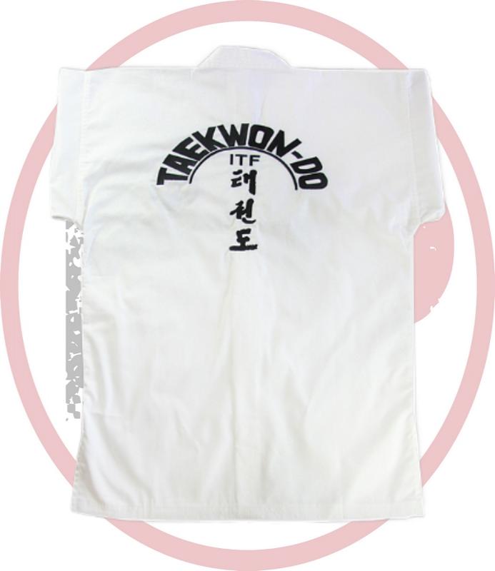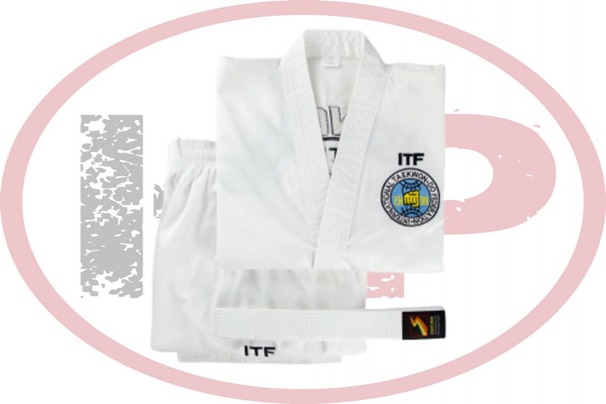 Изготовлен добок для тхэквондо ITF из смешанной ткани, поликоттон, плотностью 200 г/м². Униформа из такой ткани легко стирается и гладится, дает меньшую усадку после стирки, лучше держит форму и имеет более аккуратный "белый" вид. "White Belt" — униформа тех, кто еще не достиг черного пояса. Куртка на липучке без черных элементов униформы мастеров: окантовка, лампасы и т.д. Все изображения и надписи нанесены вышивкой, что обеспечивает хороший внешний вид и долговечность. Просторные длинные брюки на поясе удерживаются широкой резинкой и вставным шнуром. Особенность составных брюк заключена в специальной вставке, шириной несколько сантиметров, которая начинается в паху и идет до самого низа штанины, замещая внутренний шов.
