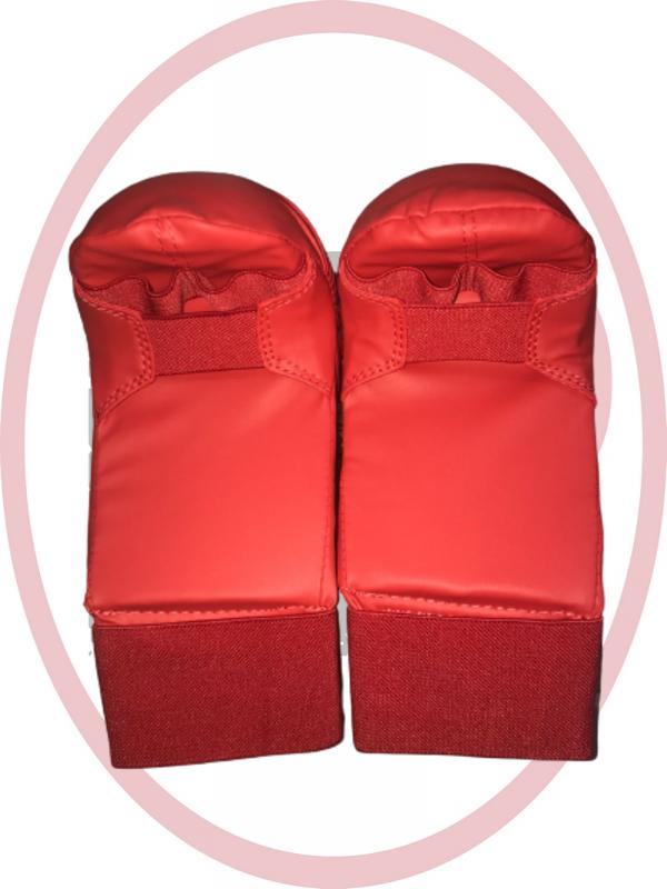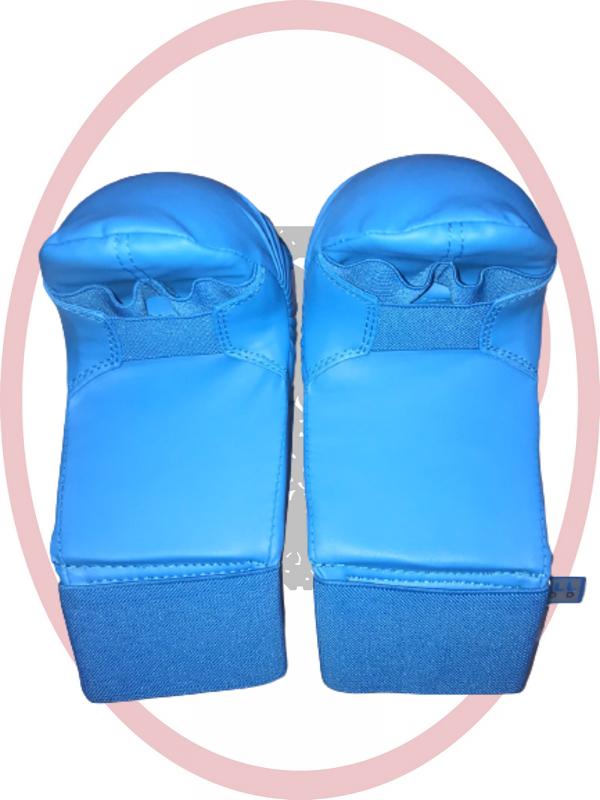 Допуск WKF, Накладки имеют анатомическую форму с очень удобным изгибом и увеличенным объемом, качественно облегают кулак. Учитывают особенности строения кисти. Крепятся на запястье благодаря широкой эластичной ленте с застёжкой Velcro. Так же есть эластичные крепления в области середины ладони и две петли из качественной и прочной резинки каждая для 2-х пальцев. Такое решение позволяет избежать быстрой деформации и износа резинки. Внутренний наполнитель - эластичная и легкая формованная пена, обеспечивает безопасность при контакте, поглощая удар. Плотность наполнителя придает легкость накладке. Внешний слой пошит из искусственной кожи, покрытой полиуретаном. Накладки имеют хорошую прочность, влагоустойчивость и износостойкость даже при активном использовании. Эластичность и качество материала обеспечивают легкость ухода за изделием.
