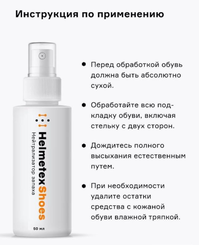 Нейтрализатор запаха Helmetex Shoes это высококонцентрированное, антибактериальное, гигиеническое средство от запаха обуви. Helmetex Shoes это средство для обуви нового поколения. Ликвидатор запаха Helmetex Shoes удаляет источник неприятного запаха внутри обуви, обладает антибактериальным действием и очищает подкладку обуви. Компактный флакон 50 мл. удобно брать с собой в поездки, при этом его хватает примерно на 300 распылений. Нетрализатор запаха для обуви Helmetex решает проблему неприятных запахов домашней, повседневной и спортивной обуви раз и навсегда. Нейтрализатор запаха Helmetex Shoes это не обычный дезодорант для обуви, а эффективное средство от запаха, которое устраняет источник неприятного запаха и бактерии и продлевает срок службы обуви. Все это позволит вернуть обуви первоначальную свежесть.