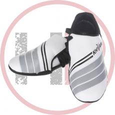 Профессиональная обувь для занятий тхэквондо. Легкая, повторяет форму ноги. Перфорация стельки дает ноге "дышать", на подошве реализованы сквозные отверстия для воздухообмена. Сама подошва сделана из нескользящего материала с протектором, обеспечивающим отличное сцепление с любой поверхностью. Модель создана без шнурков, это позволяет спортсмену выполнять любые движения без каких-либо ограничений, а также не переживать, что в неподходящий момент развяжется шнурок. Уход за обувью очень простой, ее можно даже стирать, вынув предварительно стельку. В комплекте идет яркая и удобная сумочка из водоотталкивающего материала. Материал: 40% резина ,30% полиуретан, 30% хлопок.
