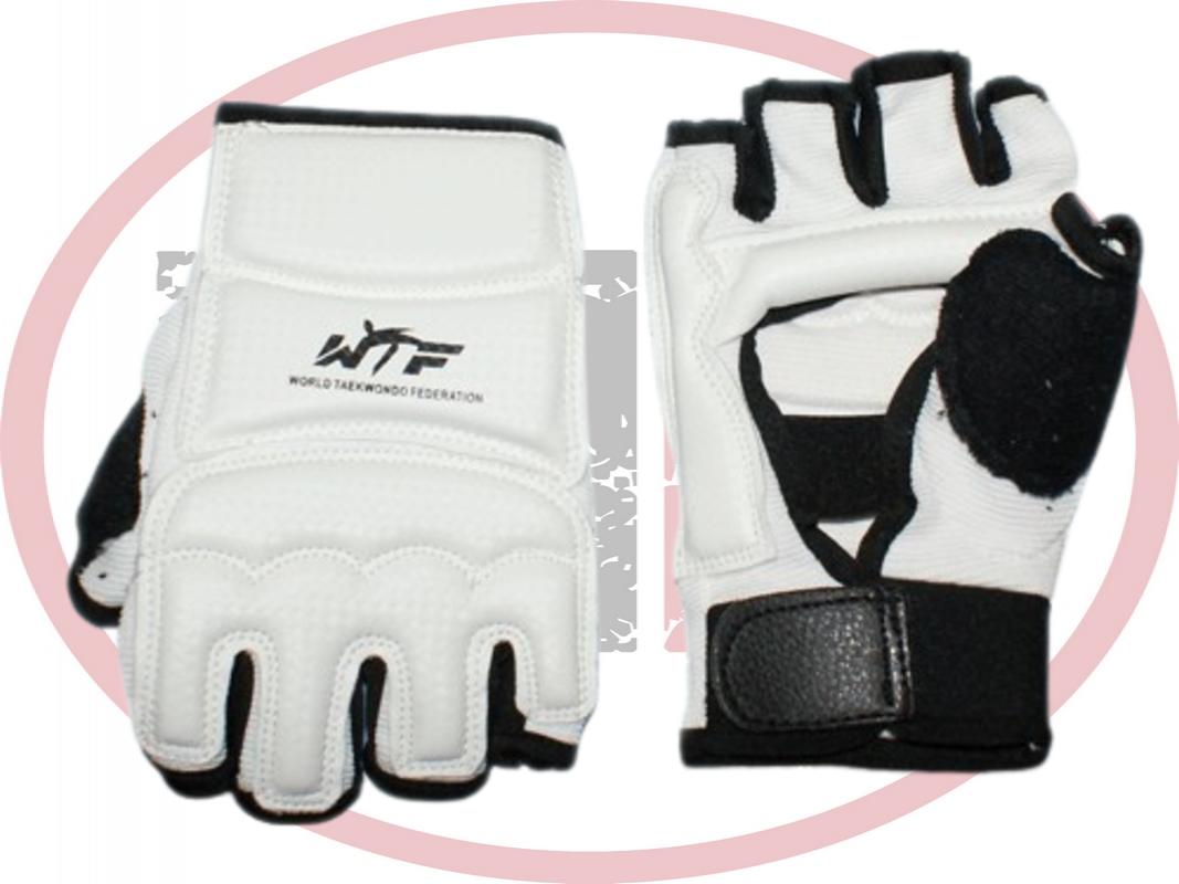Перчатки без пальцев для тхэквондо изготовлены из прочного высококачественного материала. Тыльная сторона ладони имеет вставки из вспененного ПВХ обеспечивающего защиту во время ударов. Такие перчатки незаменимая часть экипировки при ежедневных тренировках и на соревнованиях. Для большего удобства вытирания пота с лица предусмотрена мягкая вставка из махровой ткани на большом пальце. Благодаря раздельному дизайну пальцев удобно осуществлять захват. На перчатках имеется липучка, которая позволяет регулировать размер и фиксировать перчатку на запястье. Овальный вырез на ладони позволяет воздуху циркулировать.