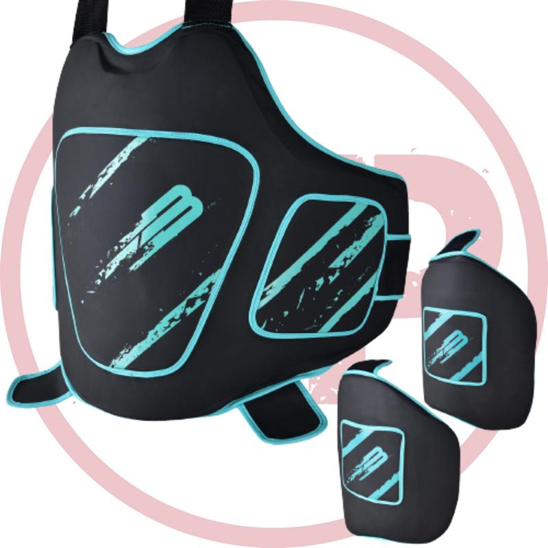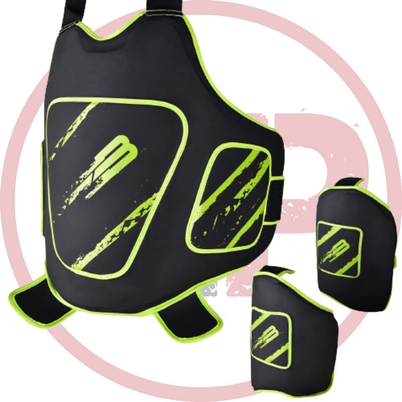 Комплект защиты BoyBo "Рыцарь" позволяет работать в полную силу по корпусу и верхней части бедра. Предназначен для отработки серийных и одиночных ударов по туловищу и бедрам. Состоит из двух частей: защитный щит (жилет) на корпус и щиты на бедра. Внешняя часть выполнена высокопрочной искусственной кожи, демпфирующий вкладыш – сочетание пенополиэтилена и пенополиуретана различной толщины. Жилет крепится на корпусе с помощью лямок с липучками. Возможна регулировка по высоте и объему.