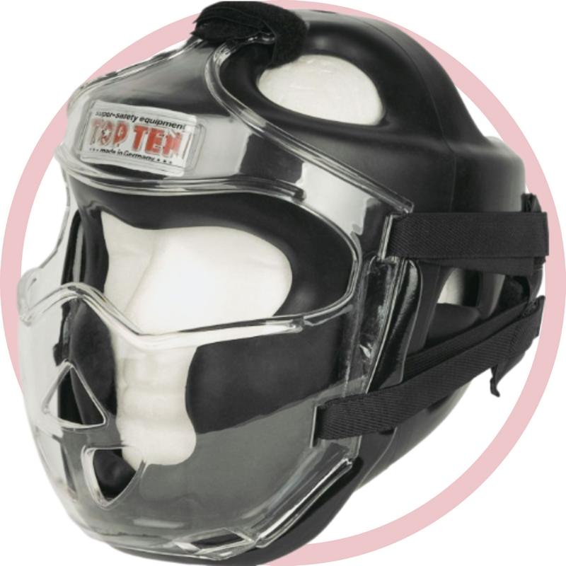 Защитная маска TOP TEN изготовлена из ударопрочного прозрачного поликарбоната и специально разработана для активного точечного боя. Прикрепляется к шлему TOP TEN за считанные секунды с помощью застежек-липучок и значительно повышает максимальную безопасность в области головы и лица. Область подбородка дополнительно защищена маской, так что удары апперкотом или коленями эффективно поглощаются. Вентиляционные отверстия на носу и во рту обеспечивают спокойное дыхание, маска при этом не запотевает. Защитную маску TOP TEN легко промыть водой и при необходимости можно дополнительно продезинфицировать. Преимущества защитной маски Top Ten: Небьющийся поликарбонат Дополнительный элемент для защиты головы Простая фиксация на липучках